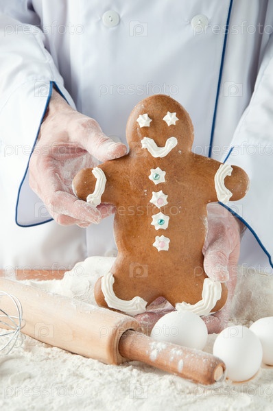 Руки пекаря, держащего свежий имбирный пряник