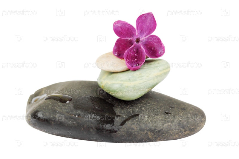 Камни для спа и сирень на белом фоне