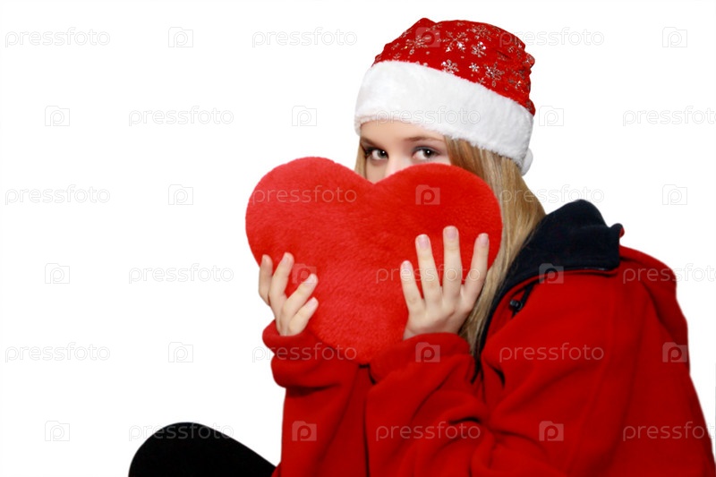 Девушка в рождественском колпаке закрывает лицо красным сердцем