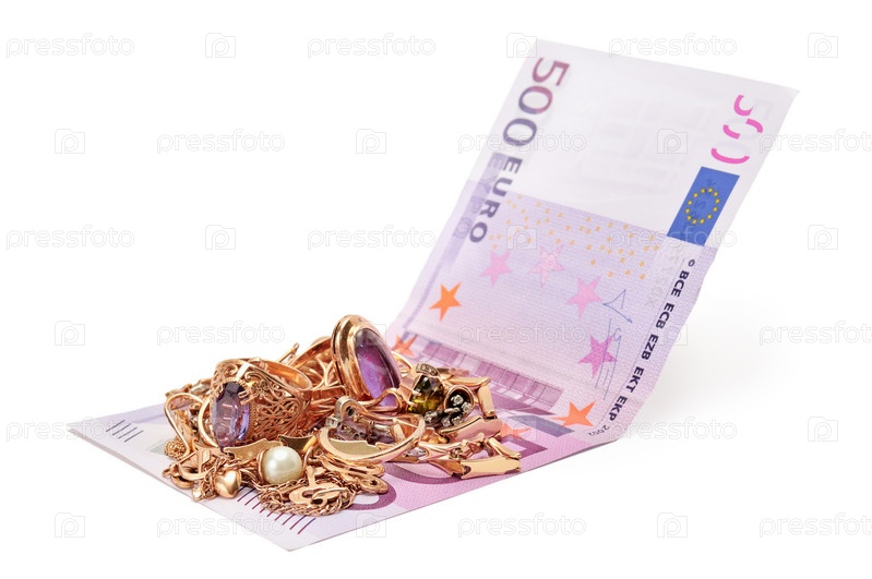 Золотые украшения и евро на белом фоне