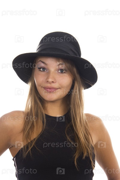 Молодая женщина в черной шляпе на белом фоне