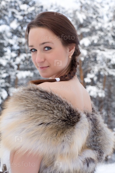 Молодая девушка с косой в меховом жилете на фоне зимнего леса