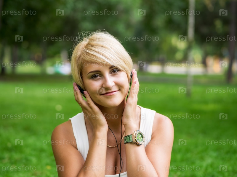Девушка в парке слушает музыку