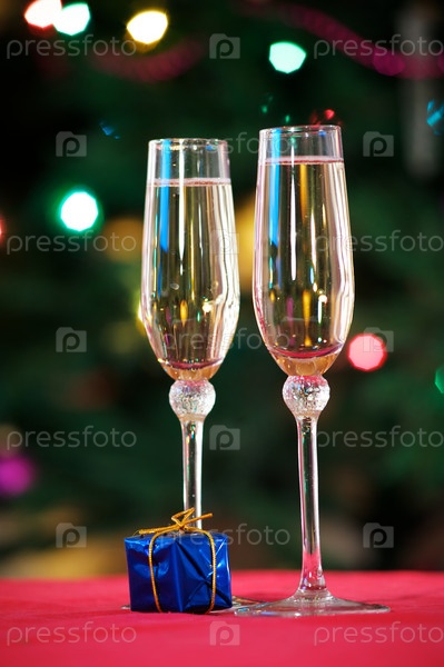 Бокалы с шампанским на фоне новогодней елки
