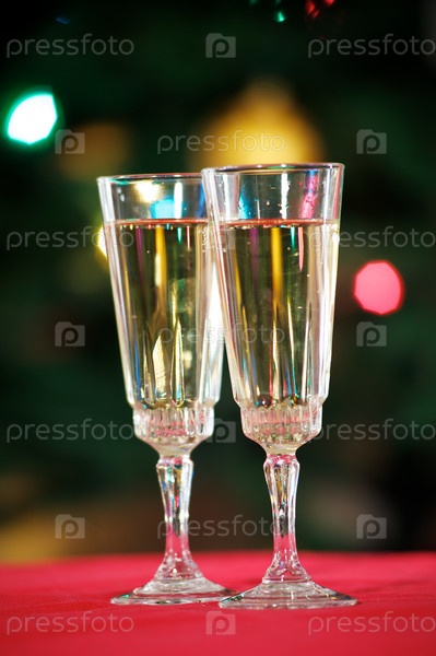 Бокалы с шампанским на фоне новогодней елки
