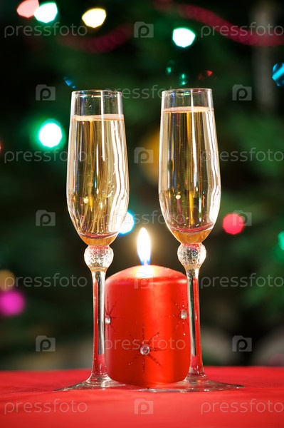 Бокалы с шампанским на фоне новогодней елки