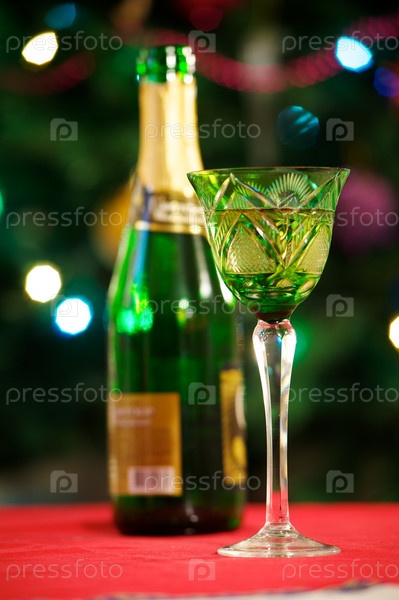 Бокал с бутылкой шампанского на фоне новогодней елки