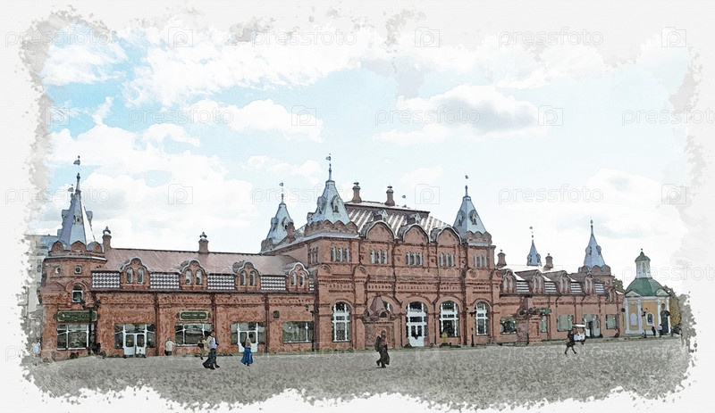 Торговые ряды на площади Сергиева Посада - акварельный рисунок