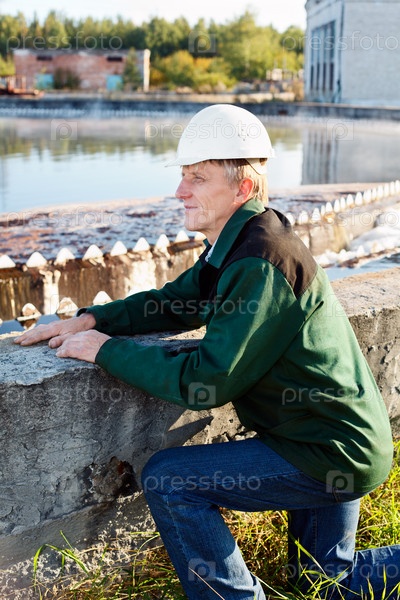 Мужчина в белой каске возле бассейна обработки сточных вод