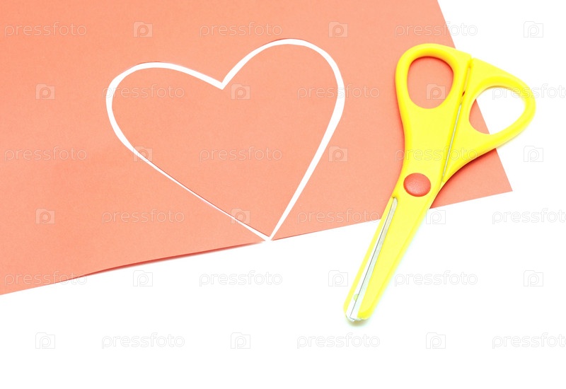 Красное сердце, вырезанное из бумаги, и ножницы на белом фоне