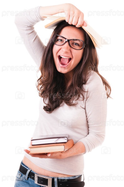 Студентка стоит с книгами на белом фоне