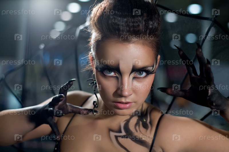 Лицо женщины в образе черного дракона с красивым макияжем и черными когтями