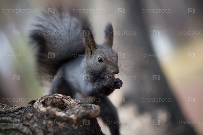 Серая белка на ветке дерева