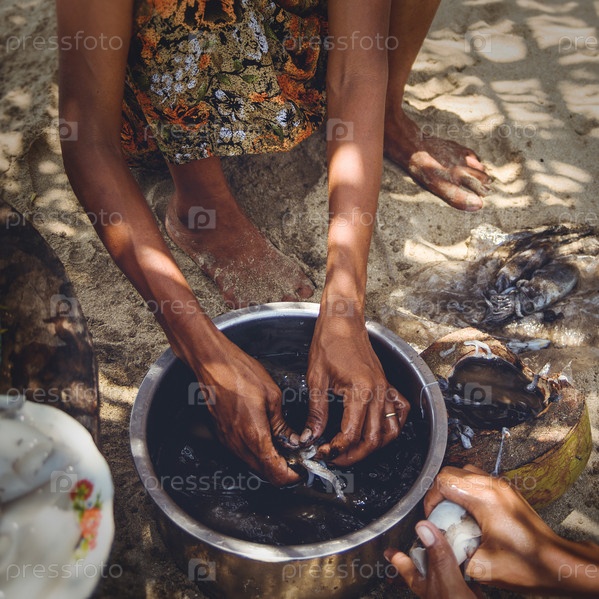 Женщина очищает кальмаров