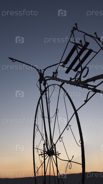 Переднее колесо, руль и сиденье велосипеда из металлических прутьев на фоне заката
