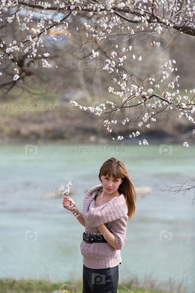 Красивая женщина под цветущим деревом