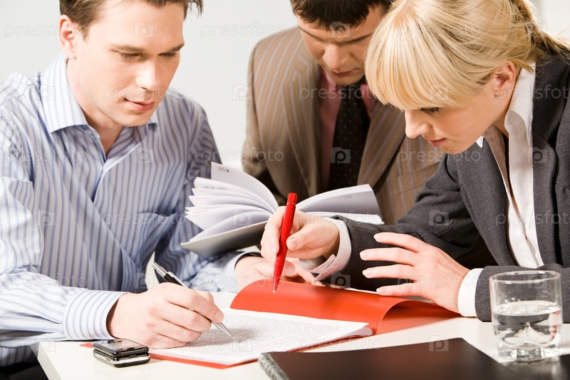 Портрет деловых людей, указывающих на текст рабочего документа