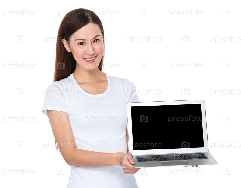 Красивая девушка показывает ноутбук
