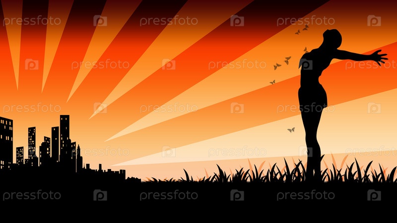 Силуэт женщины с распростертыми объятиями на фоне заката