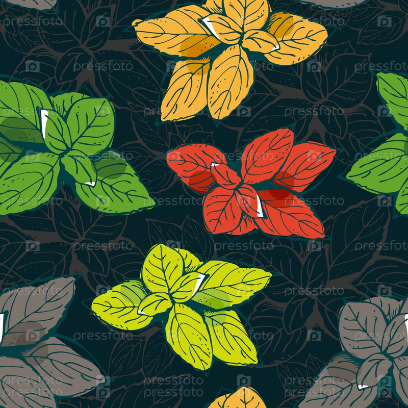 Бесшовный векторный шаблон с цветными листьями на темно-коричневом фоне