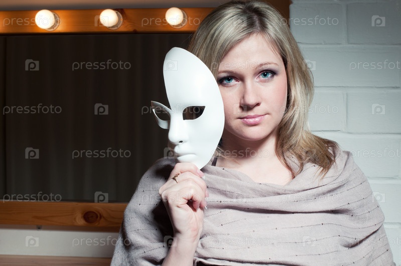 Загадочная молодая женщина с театральной маской на фоне зеркала
