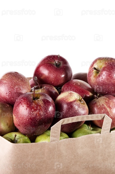 Свежие яблоки в бумажном пакете на белом фоне