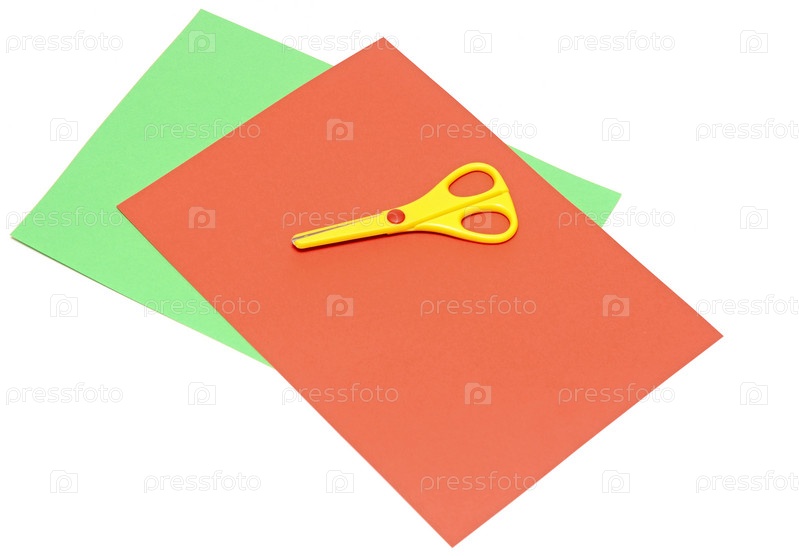 Цветная бумага и ножницы, изолированные на белом фоне