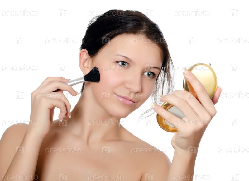 Молодая красивая девушка с кисточкой для макияжа и зеркальцем