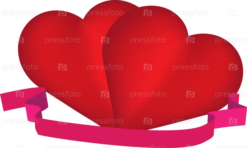 Два сердечка и розовая лента на белом фоне