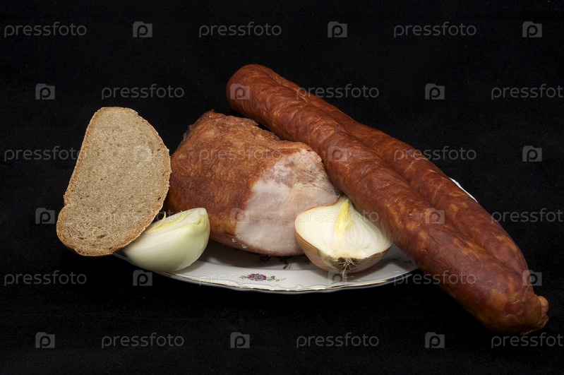 Колбаска и копченое мясо на тарелке на черном фоне