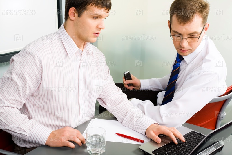 Портрет двух бизнесменов, смотрящих на ноутбук