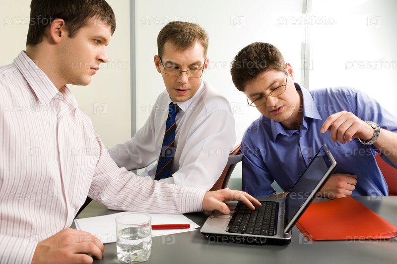 Группа из трех бизнесменов, взаимодействующих в офисе