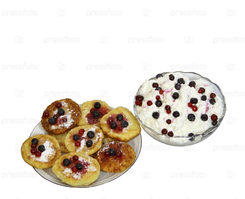 Творог в вазе с ягодами и лепешки из творога