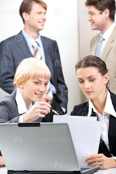 Деловая женщина дает консультацию своему коллеге на фоне деловых людей