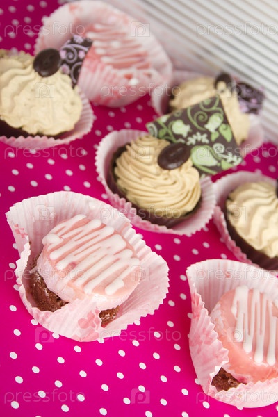 Много вкусных пироженок на розовой скатерти крупным планом