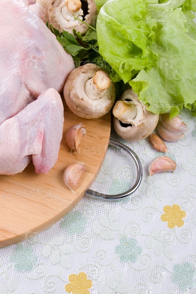 Сырая курица с овощами на деревянной доске