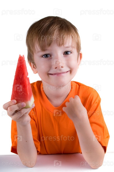 Мальчик с арбузом на белом фоне