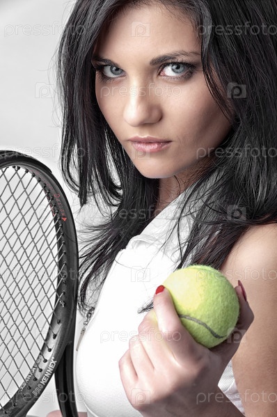 Красивая девушка с мячом и ракеткой для большого тенниса в руках, на сером фоне