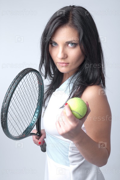Красивая девушка с мячом и ракеткой для большого тенниса в руках, на сером фоне