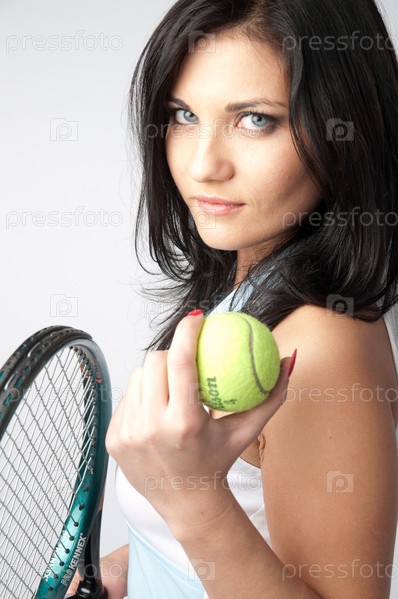 Красивая девушка с мячом и ракеткой для большого тенниса в руках, на сером фоне