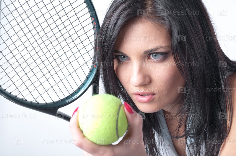 Красивая девушка с мячом и ракеткой для большого тенниса в руках, на сером фоне