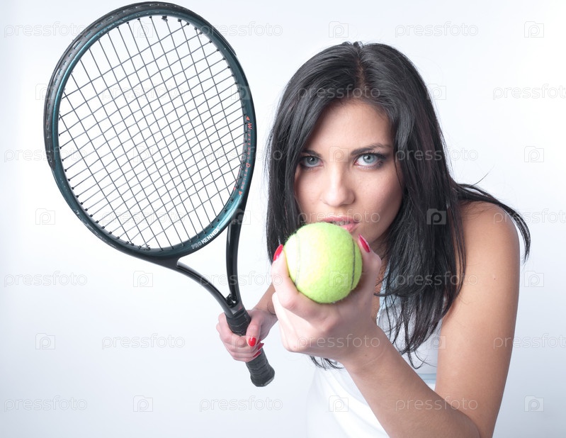 Красивая девушка с мячом и ракеткой для большого тенниса в руках, на сером фоне