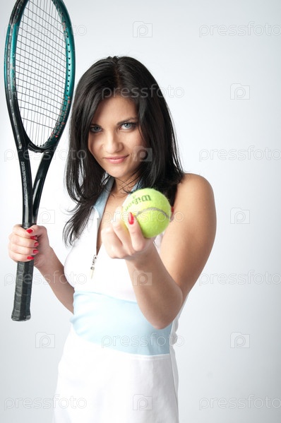 Красивая девушка с мячом и ракеткой для большого тенниса в руках, на сером фоне