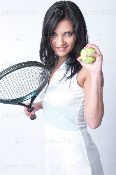 Красивая девушка с мячом и ракеткой для большого тенниса в руках, на сером фоне