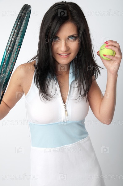 Красивая девушка с мячом и ракеткой для большого тенниса в руках, на сером фоне