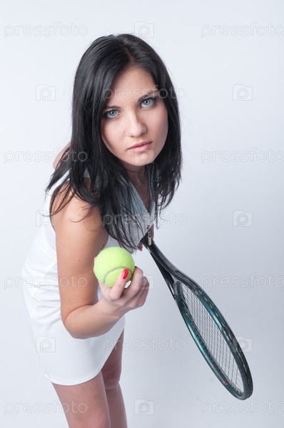 Красивая девушка с мячом и ракеткой для большого тенниса в руках, на сером фоне