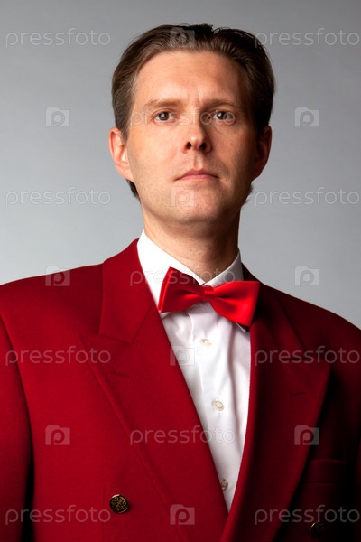 Мужчина в малиновом пиджаке и красной бабочке на сером фоне