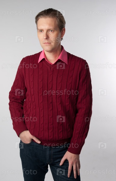 Мужчина в малиновом свитере стоит на сером фоне