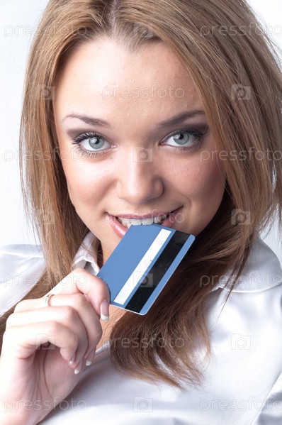 Портрет симпатичной девушки с банковской картой около рта
