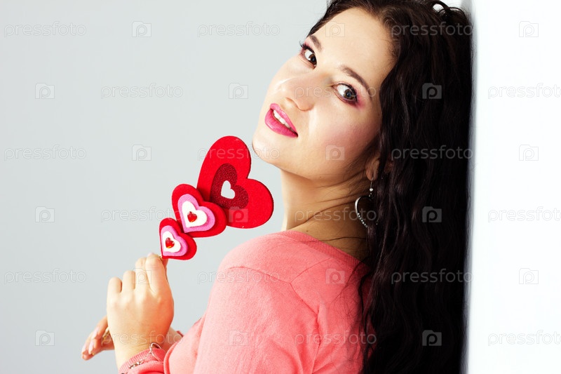 Красивая молодая брюнетка с красными сердцами, изолированная на белом фоне